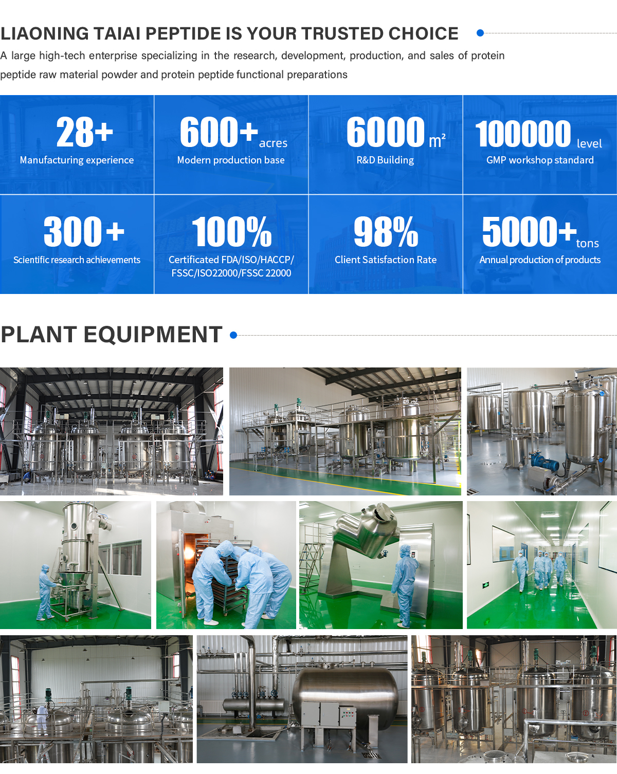 The group has a modern production base of more than 600 acres, a research and development building of more than 6,000 square meters, a 100,000-level GMP workshop standard, an annual production capacity of more than 5,000 tons of small molecule peptide raw materials and products, and more than 50 kinds of independent products. It has a number of core technology patents in the peptide industry: its own single-substance extraction technology, full-substance chain extraction technology, its own enzymatic hydrolysis technology, and more than 300 scientific research achievements such as the core technology for the extraction of small molecule peptides from herbs.